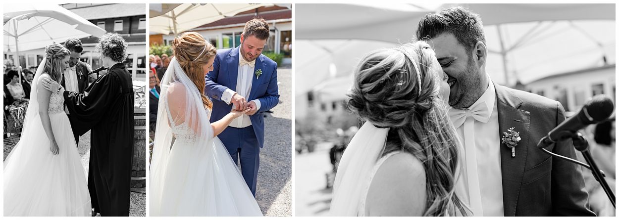 An einem wunderschönen Sommertag im Juni 2019 war es soweit: Die kirchliche Trauung im Freien auf dem Hofgut Hagenbach in Backnang von Vanessa und Benny wurde gefeiert. Selbstverständlich habe ich, wie eigentlich vor jeder Hochzeit ehrlich gesagt, eifrig die Wettervorhersage gecheckt, gehofft und ein wenig mitgebangt – denn die evangelische Trauung sollte unter freiem Himmel im Hof des Guts stattfinden. Die Wetterlage war, wie eigentlich üblich Mitte Juni, unbeständig, gewittrig und quasi eine Wundertüte. Petrus hat es aber sehr gut mit meinem Brautpaar und seinen Gästen gemeint – es war ein herrlicher Tag mit einem Mix aus Sonne und weißen, bauschigen Wolken bei sommerlichen Temperaturen.