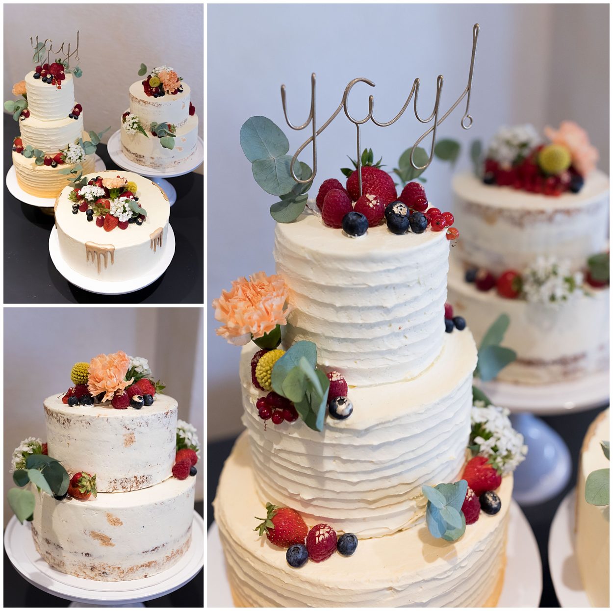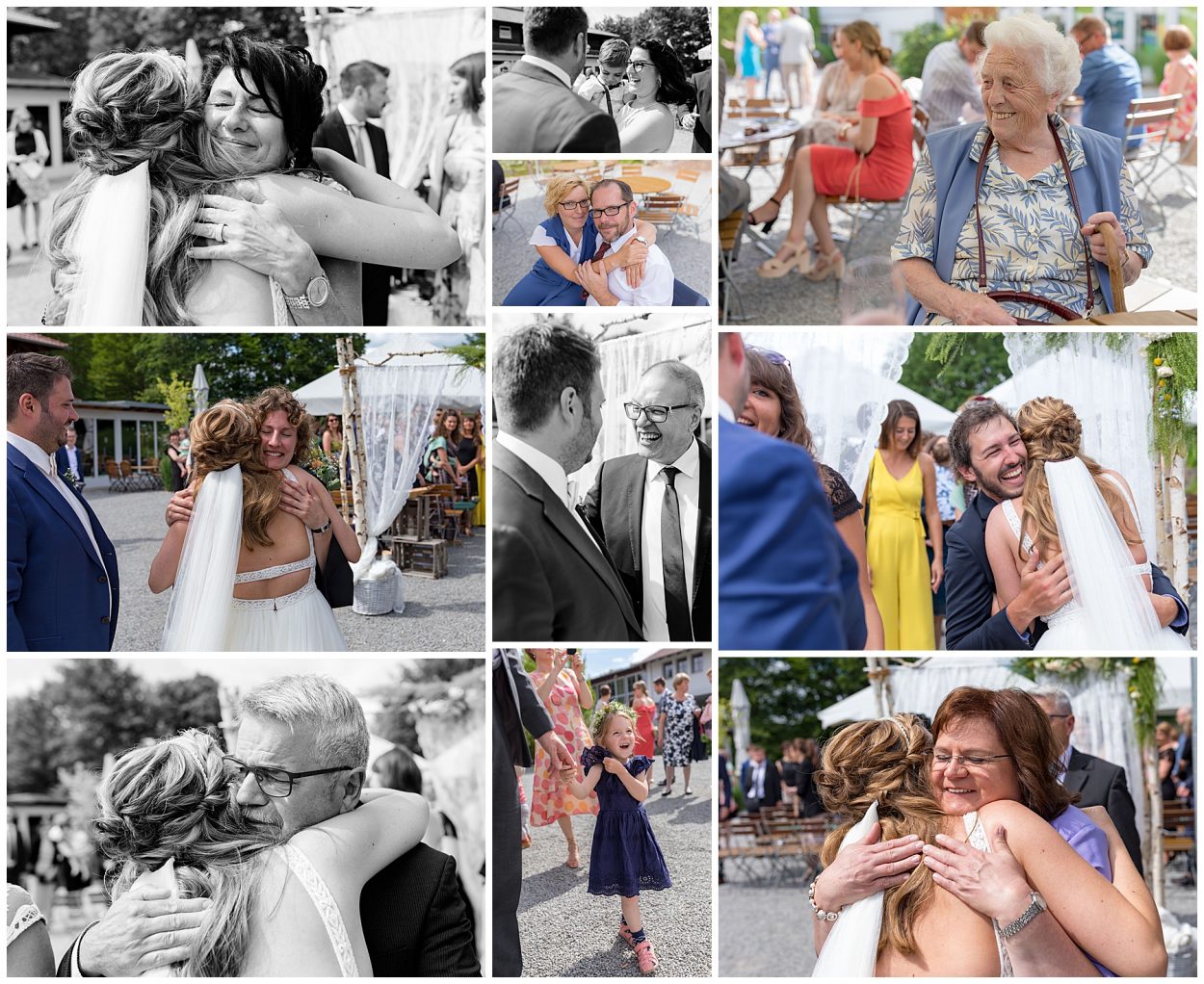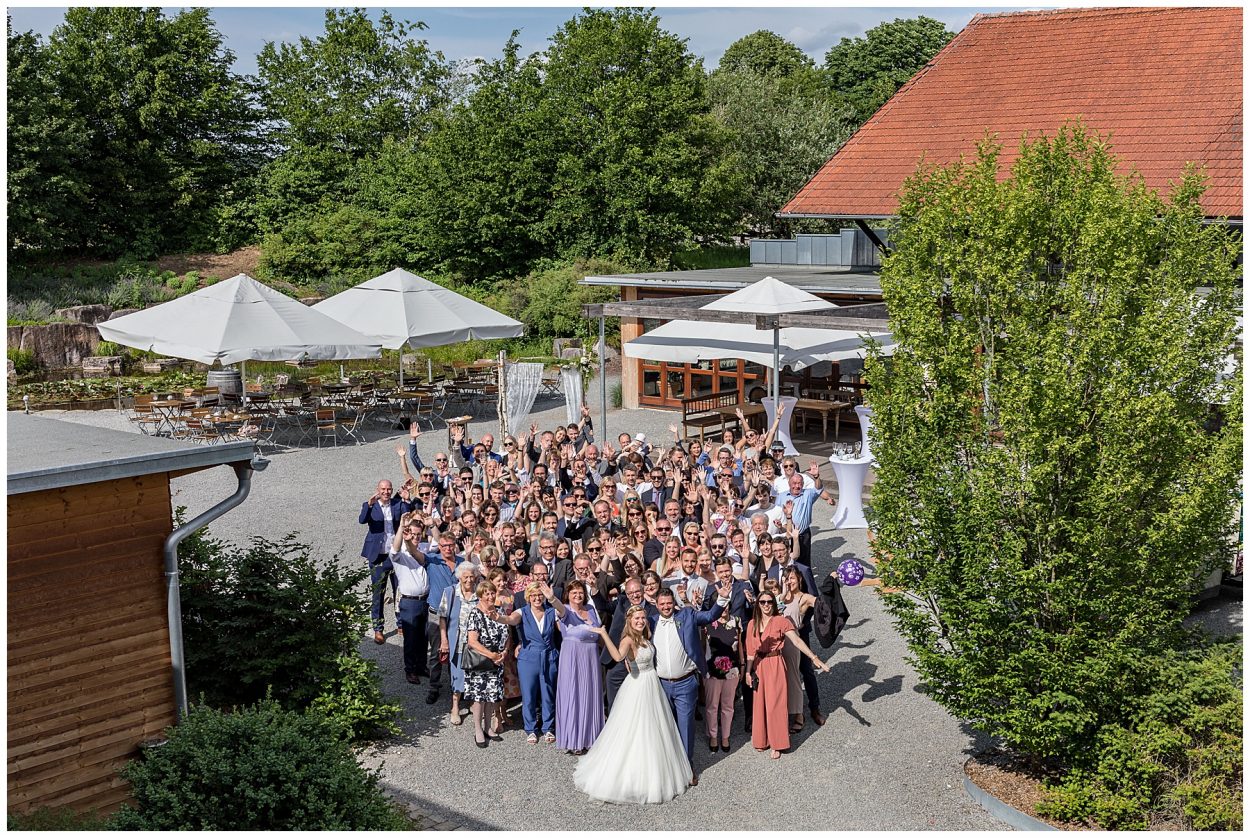 Im Anschluss an die Trauung und den herrlich fröhlichen Gratulationen der Gäste (ich liebe diesen Teil der Reportage) gab es einen Sektempfang und Stärkung in Form von Kaffee & Kuchen mit einer Trio-Hochzeitstorte, so eine schöne Idee! Die Gäste haben dabei die angenehme und entspannte Atmosphäre im Hofgut Hagenbach sehr genossen und sich auf die verschiedenen Sitzgelegenheiten innen wie außen verteilt. Wir haben die Gelegenheit genutzt und die Familienfotos, die im Vorfeld gut geplant und besprochen waren, gemacht – auch so ein wichtiger Punkt im Tagesablauf! Ich finde es wirklich fast unersetzbar, diese Fotos einzuplanen: Brautpaarfotos mit den Eltern, den Großeltern, den Geschwistern und den Trauzeugen sind eigentlich „Pflicht“ bei guter Planung im Vorfeld auch schnell gemacht. Auch ein Gruppenbild haben sich die beiden gewünscht und ich durfte dafür im Hofgut Hagenbach einen Büroraum in der zweiten Etage nutzen, um ein großes Bild von oben machen zu können – vielen Dank noch mal dafür!