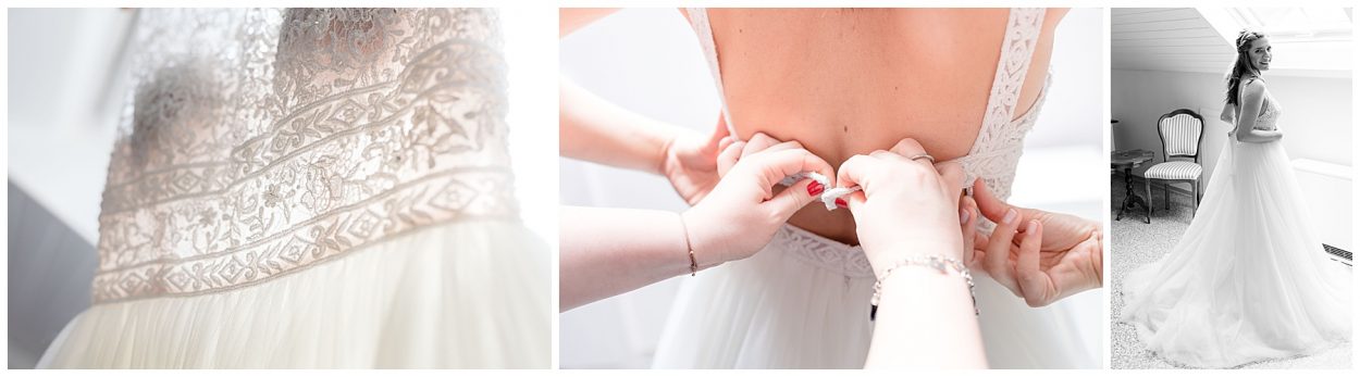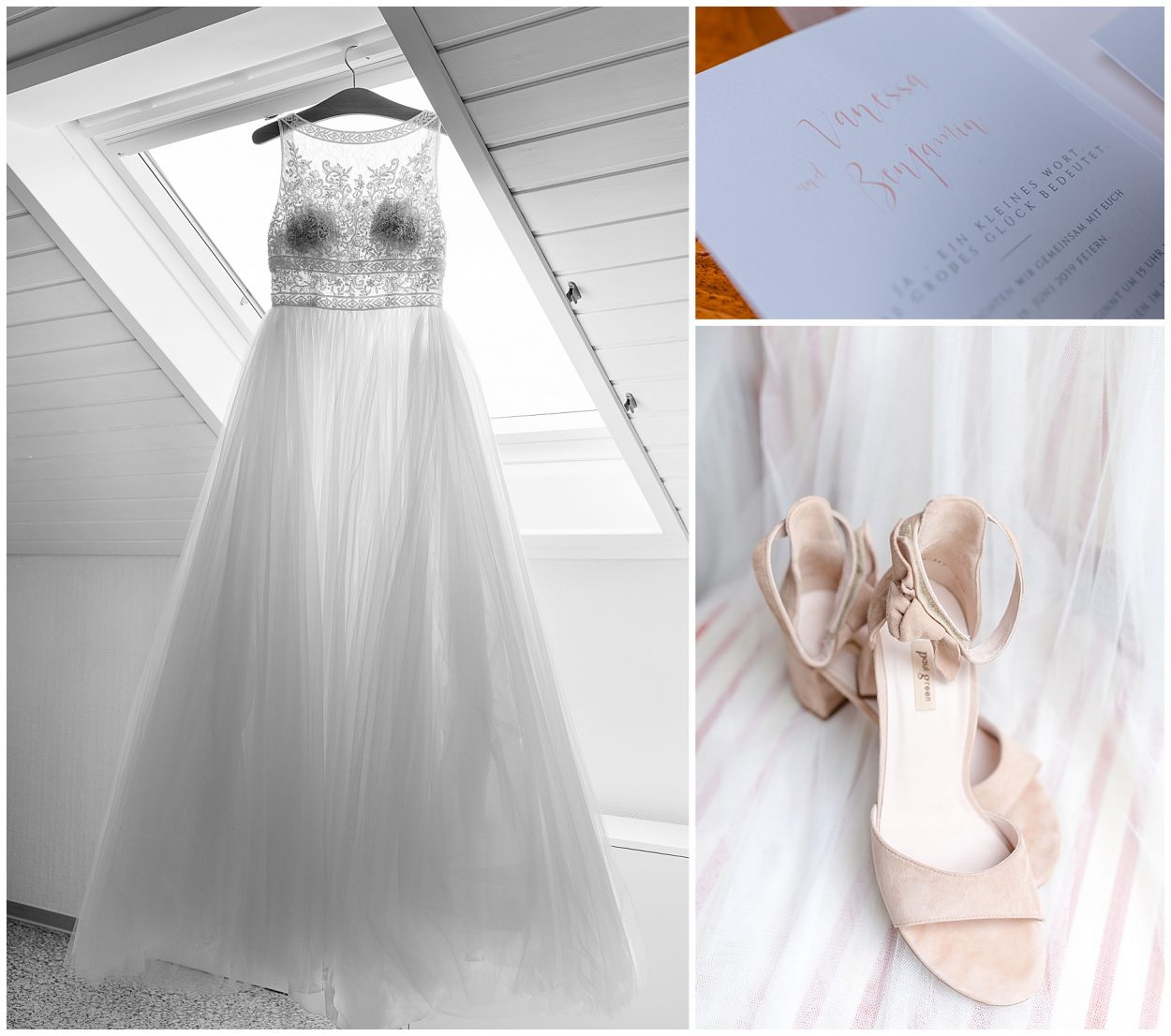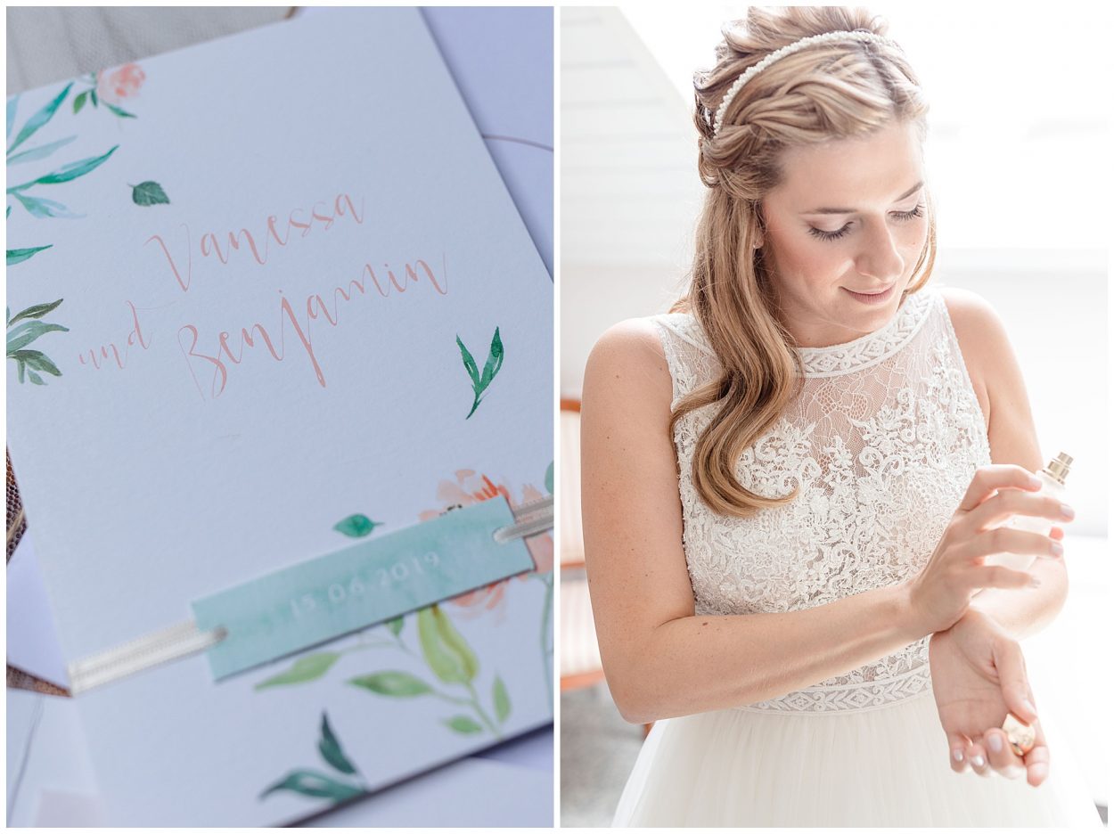 Das Getting Ready von Vanessa fand in ihrem Elternhaus statt, die Brautmutter hat dort nämlich einen Friseursalon und hat es sich nicht nehmen lassen, ihrer Tochter die Brautfrisur selber zu machen. Das Make-Up hat eine Namensvetterin der Braut, die liebe Vanessa Deiss gezaubert, wir sind schon fast „alte Bekannte“, drei meiner Bräute hat Vanessa nun schon wunderhübsch gestylt und ich kann sie euch sehr empfehlen. Die Trauzeugin der Braut, zu der Zeit schwanger, kam dazu, um ihrer Freundin das Kleid anzuziehen und sie auf dem Weg zum First Look in Backnang am Hofgut Hagenbach zu begleiten. Vanessa hatte noch ein kleines Geschenk für ihre Lari – ist das nicht einfach toll? Es sind die kleinen Gesten auf die es ankommt, finde ich!