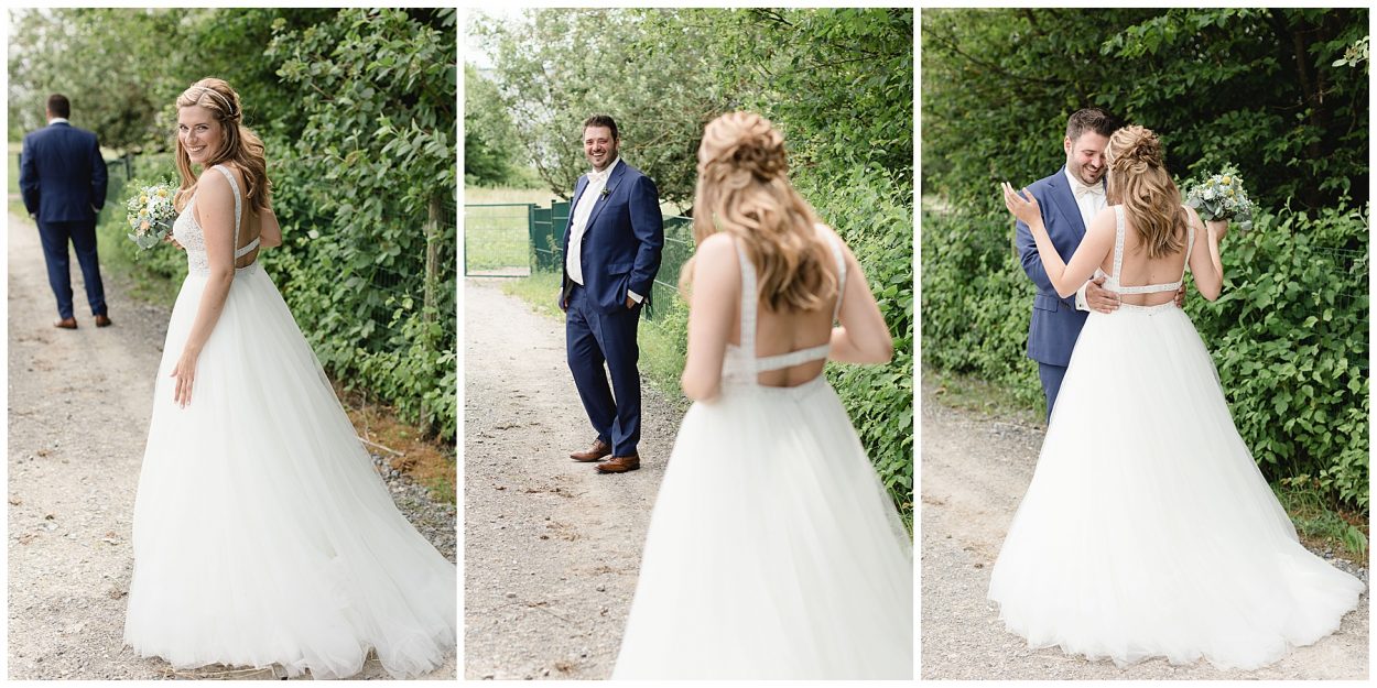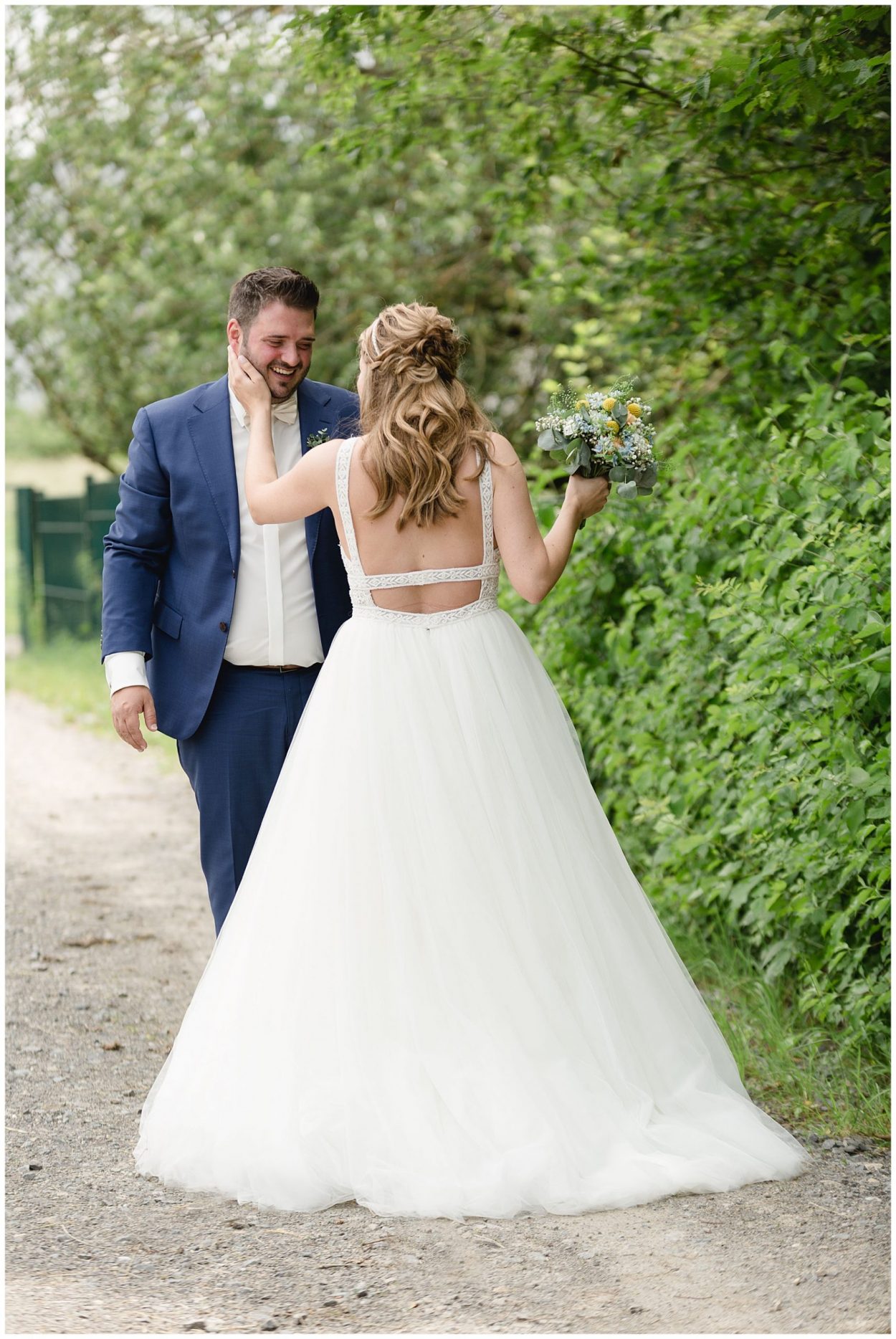 Dann war er da – der große Moment des First Looks. Benny, der Bräutigam war schon am Hofgut Hagenbach angekommen und hatte sich noch um die letzten Details gekümmert. Wir haben uns ein ruhiges Plätzchen gesucht und dann kam seine Braut und WOW – das ist schon ein besonderer Moment, seine Frau zum ersten Mal als Braut zu sehen.