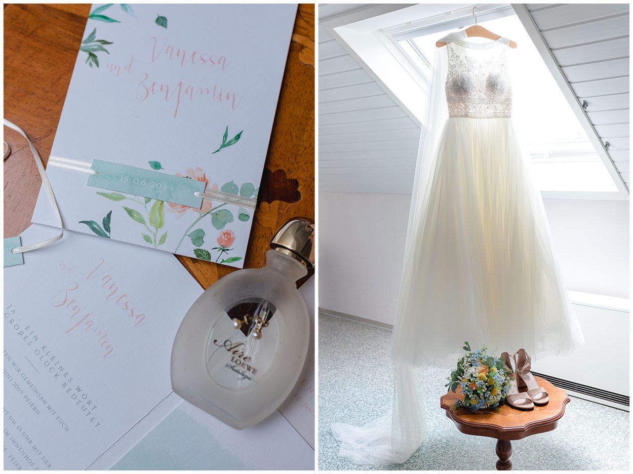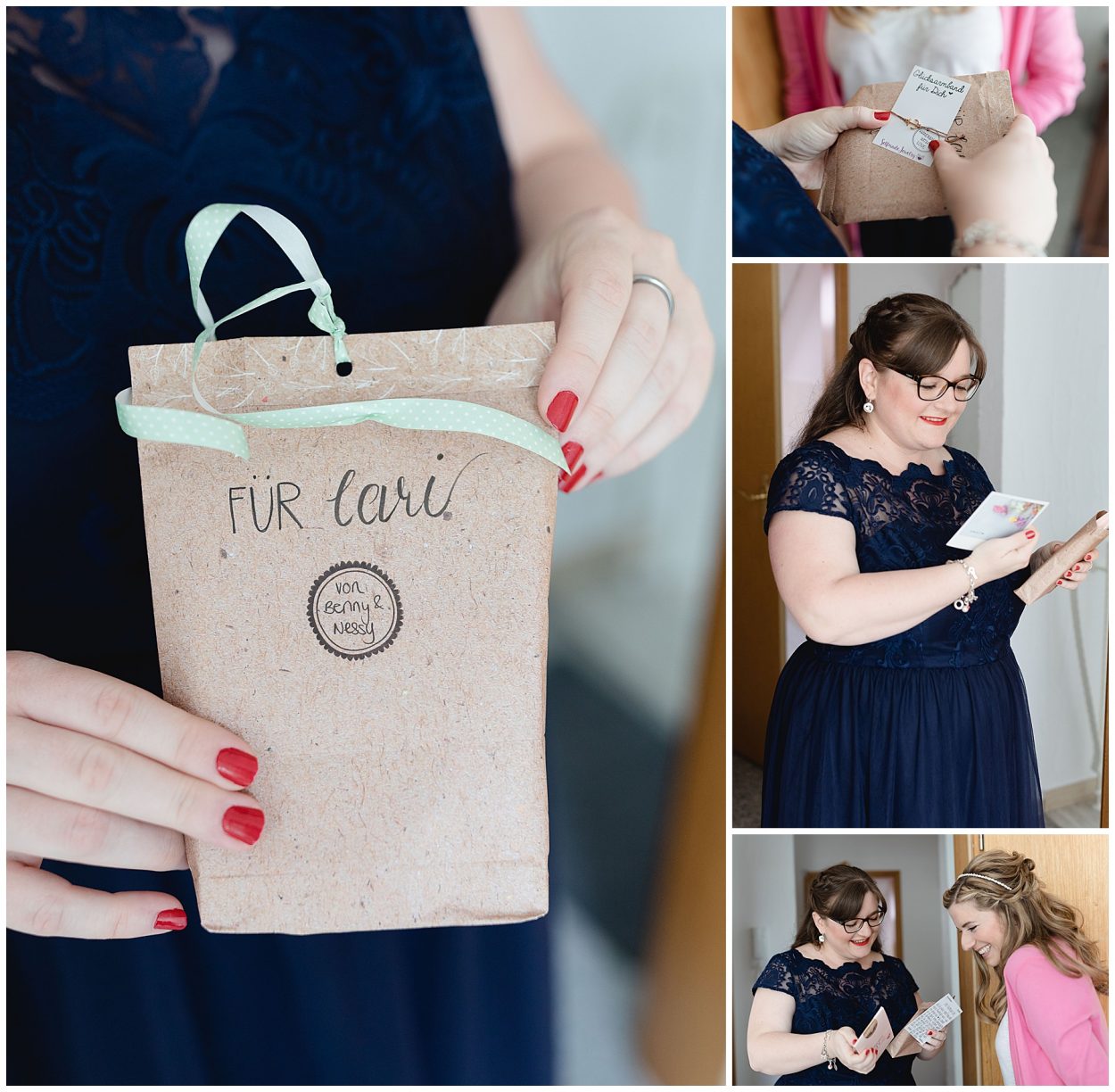 Das Getting Ready von Vanessa fand in ihrem Elternhaus statt, die Brautmutter hat dort nämlich einen Friseursalon und hat es sich nicht nehmen lassen, ihrer Tochter die Brautfrisur selber zu machen. Das Make-Up hat eine Namensvetterin der Braut, die liebe Vanessa Deiss gezaubert, wir sind schon fast „alte Bekannte“, drei meiner Bräute hat Vanessa nun schon wunderhübsch gestylt und ich kann sie euch sehr empfehlen. Die Trauzeugin der Braut, zu der Zeit schwanger, kam dazu, um ihrer Freundin das Kleid anzuziehen und sie auf dem Weg zum First Look in Backnang am Hofgut Hagenbach zu begleiten. Vanessa hatte noch ein kleines Geschenk für ihre Lari – ist das nicht einfach toll? Es sind die kleinen Gesten auf die es ankommt, finde ich!